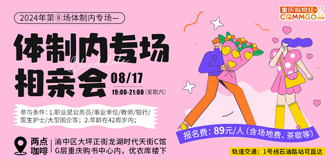 婚恋市场中的第一梯队是什么职业呢?公务员?老师?医生?父母眼中的“铁饭碗”是什么职业呢?公务员?公务员还是公务员? ▼ 公教医等单位的从业人员也是福利好待遇好、工作稳定的代名词为了提高匹配度和精准交友这次特意为大家带来了“体制内”专场 ▼ 08/17 相约时代天街C馆两点咖啡一场公教医等体制内专场联谊在等你 主办单位:重庆购物狂 举办时间:08月17日(星期六)19:00-21:00 活动地点: