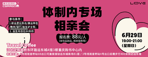 今晚的体制内专场可接受男女嘉宾现场报名有空的同学可直接来 —————— 婚恋市场中的第一梯队是什么职业呢?公务员?老师?医生?父母眼中的“铁饭碗”是什么职业呢?公务员?公务员还是公务员? ▼ 公教医等单位的从业人员也是福利好待遇好、工作稳定的代名词为了提高匹配度和精准交友这次特意为大家带来了“体制内”专场 ▼ 06/29 相约观音桥步行街Travel coffee 一场公教医等体制内专场联谊在等