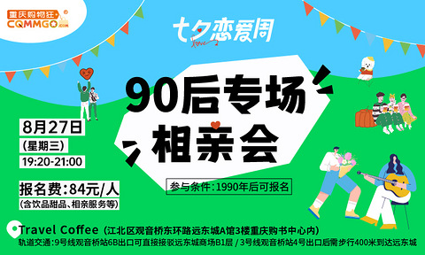 今晚的90后专场相亲会男女嘉宾均可现场报名符合要求的同学可直接来 —— 龄好像中催着我们往前走不知不觉中90后已经过半迈入而立之年了 ▼ 今年2025年马上又过了3/5了哦还是得抓紧时间脱单 ▼ 08/27 相约观音桥远东城Travel Coffee一场90后精准交友在等你 主办单位:重庆购物狂 举办时间:08月27日(星期三)19:20-21:00举办地点:Travel Coffee(江北区