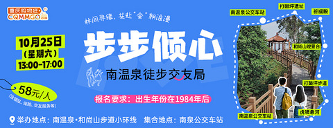 城市里的我们,总在匆忙擦肩这一次,不如放慢脚步一起去轻徒步 因为在大自然的吸引力法则下志同道合的人哪怕是翻山越岭也总会相遇! ▼ 本次徒步路线全程约4公里路线南温泉公交车站-打鼓坪遗址-祈福殿-和尚山观景台-打鼓坪步道-虎啸悬河-南温泉公交车站是一个轻松的小环线 集亲近自然、便捷到达、约会吸氧、打卡小华山为一体 95%的路段为石板路,且90%路段有香樟树遮挡几乎晒不到太阳 ▼ 前方有风景身边有缘