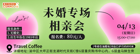 本周日下午3点的未婚专场可接受女生现场报名符合要求的女嘉宾可来哦 —— 有些未婚同学可能其他择偶要求能适当放宽但一定无法接受对方有婚史那么专属于未婚同学的“未婚”专场来咯 ▼ 区别于其他专场相亲会你可能会遇见有婚史的小伙伴未婚专场则全部是无婚史哦 只要你主动我们的故事 就开始了 ▼ 04/13快来时代天街C馆两点咖啡遇见春天遇见你,让你心动“狂飙” 主办单位:重庆购物狂 举办时间:04月13日(