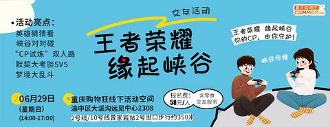 活动主题:王者荣耀?缘起峡谷 交友活动举办时间:06月29日(星期日)14:00-17:00 举办地点:重庆购物狂线下活动空间 详细地址:渝中区大溪沟远见中心2308 轨道交通:2号线/10号线曾家岩站2号出口步行约350米 报名费:58元/人(含零食、交友服务) 活动亮点: 英雄猜猜看 峡谷对对碰 “CP试炼”双人路 默契大考验5V5 梦境大乱斗 心动信号:峡谷传情 辅助文字:王者荣耀?缘起峡