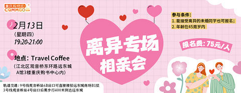 今晚的离异专场可接受男士现场报名有空的男士可直接来现场报名即可 ———————— 在这个孤独的星球上你我皆是亿万分之一你是否渴望一场妙不可言的遇见? ▼ 一次推心置腹的相知就像寂静长夜里的两颗星 彼此照亮 ▼ 期待一场“第二春”的重启吗?(离异专场)等你赴约 主办单位:重庆购物狂 举办时间:02月13日(星期四)19:20-21:00 举办地点:Travel Coffee(江北区观音桥东环路远东