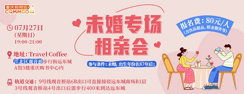 有些未婚同学可能其他择偶要求能适当放宽但一定无法接受对方有婚史那么专属于未婚同学的“未婚”专场来咯 ▼ 区别于其他专场相亲会你可能会遇见有婚史的小伙伴未婚专场则全部是无婚史哦 只要你主动我们的故事 就开始了 ▼ 07/27相约观音桥远东城Travel Coffee一场未婚专场精准交友在等你 主办单位:重庆购物狂 举办时间:07月27日(星期日)19:00-21:00 举办地点:Travel C