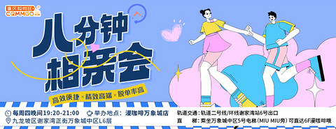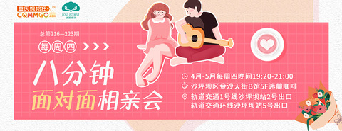 8分钟面对面相亲会的定义—— 什么叫8分钟相亲会,8分钟相亲会就是每8分钟的时间换一个异性和你相亲,那么这一场相亲会有多少异性,就换多少轮,8分钟相亲会就是这么的高效和便捷哦! 11月每周四活动地点:举办地点:榭岸咖啡(江北区大庙龙湖新壹街公交站旁龙湖络绎广场3楼樊登书店内) 11月八分钟相亲会报名链接戳https://go.cqmmgo.com/forum-222-thread-85241666