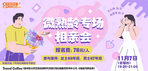 重要通知:今晚的微熟龄专场活动可接受男女嘉宾现场报名哦有空的可直接来哦 —————— 时光如飞刀刀刀催人老 ▼ 不过只要你现在鼓起勇气一切都来得及爱得深、爱得早不如爱得刚刚好 ▼ 11/07 相约时代天街C馆 Travel Coffee给爱情加个急,只为遇见你 主办单位:重庆购物狂举办时间:11月07日(星期四)19:20-21:00 举办地点:Travel Coffee(渝中区大坪正街龙湖时代