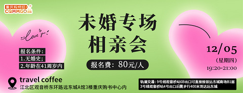 本周四的90后专场目前男士已满目前仅接受女嘉宾报名啦 —————— 年龄好像中催着我们往前走不知不觉中90后已经过半迈入而立之年了 ▼ 今年2025年马上又过了1/4了哦还是得抓紧时间脱单 ▼ 03/27 相约观音桥远东城Travel Coffee一场90后精准交友在等你 主办单位:重庆购物狂 举办时间:03月27日(星期四)19:20-21:00 举办地点:Travel Coffee(江北区