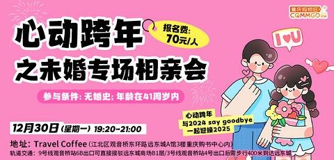 今年跨年什么计划?一个人跨?还是去当朋友的电灯泡? - 不如来一场不一样的跨年吧即刻报名相亲会找个对象一起跨年一起携手迈进更美好的2025年吧 12.30,跨年夜前夕一起遇见心动的ta 主办单位:重庆购物狂举办时间:12月30日(星期一)19:20-21:00 举办地点:Travel Coffee(江北区观音桥东环路远东城A馆3楼重庆购书中心内) 轨道交通:9号线观音桥站6B出口可直接接驳远东城