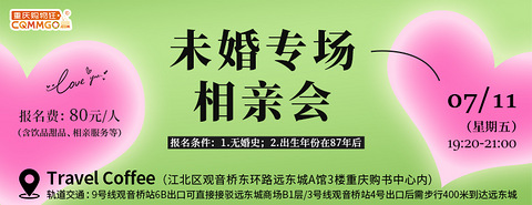有些未婚同学可能其他择偶要求能适当放宽但一定无法接受对方有婚史那么专属于未婚同学的“未婚”专场来咯 ▼ 区别于其他专场相亲会你可能会遇见有婚史的小伙伴未婚专场则全部是无婚史哦 只要你主动我们的故事 就开始了 ▼ 07/11相约观音桥远东城Travel Coffee一场未婚专场精准交友在等你 主办单位:重庆购物狂 举办时间:07月11日(星期五)19:20-21:00 举办地点:Travel C