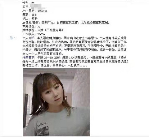 本人介绍:女,87年,211硕士,教师,未婚未育,感情过往简单无不良嗜好,身高164cm,不瘦不胖,会做简单北方口味饭菜,在重庆一所民办大专学校任教,收入年14万,在工作单位旁个人公积金贷款一套两居室,没车,生活节俭也不亏待自己,性格温柔,熟人话多,不熟的人容易尴尬不像北方人的北方人。 对男方要求:本科学历及以上相似的教育更容易在同一个频道上。希望对方责任心重,情绪稳定,有担当,无家暴,不赌博,尽