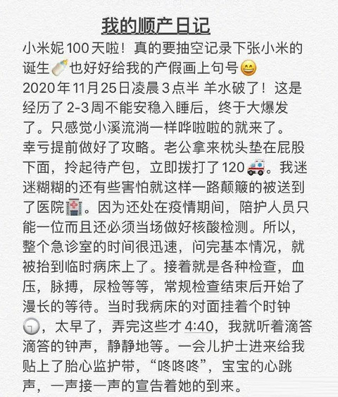 生娃过程 10月20日:产检38周+4,由于夜尿频频,医生摸腹说胎儿已入盆五分之二,估摸这几天发作; 10月21日:俩麻麻同时就位,晚上一起吃串串; 10月22日:早上6点半见红,立马洗头洗澡刮毛毛; 早上9点到晚上21点--宫缩间隔7-10分钟,每次持续不到1分钟(痛经感能忍受)。上午相公去做核酸~我下午16点半去做核酸(网上说见红后24-48小时发作,所以