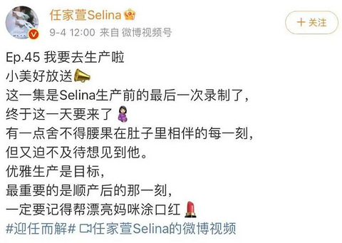 妈妈们,你家宝宝出生时有多重?是顺还是剖呢? 9月4日,Selina在社交平台透露自己入院待产了,心情是又紧张又激动。 有一点舍不得小腰果(宝宝小名)在肚子里相伴的每一刻,但又迫不及待的想要见到他。
