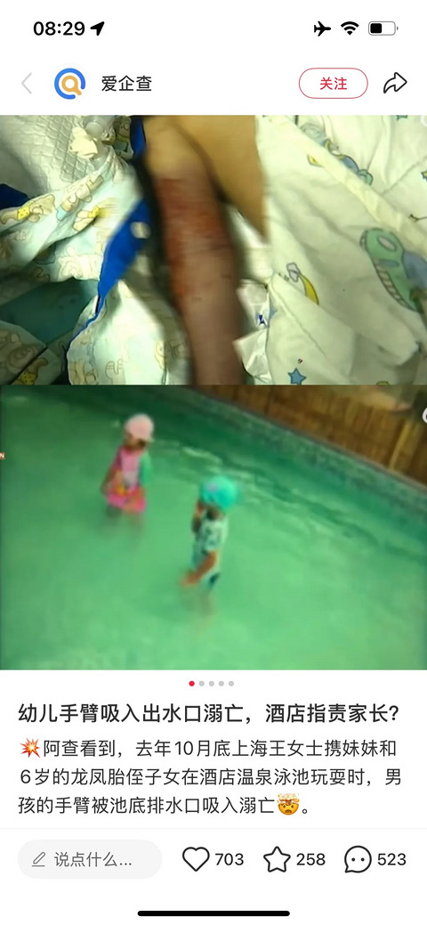 昨天看到的新闻,非常难受。是一家人带着六岁的龙凤胎儿女去安吉的度假酒店玩,孩子们在很浅的温泉池里,大人就在岸边看着。龙凤胎弟弟手被没有盖子的出水口吸住了,整个人在水里,大人第一时间就下去救了,但是吸力太大根本拉不出来(见下图的手臂图,哎),而且边上根本没有工作人员帮忙,也尝试过嘴巴给孩子给气,但是没用。小孩子就这样活活在水里溺水而亡!
