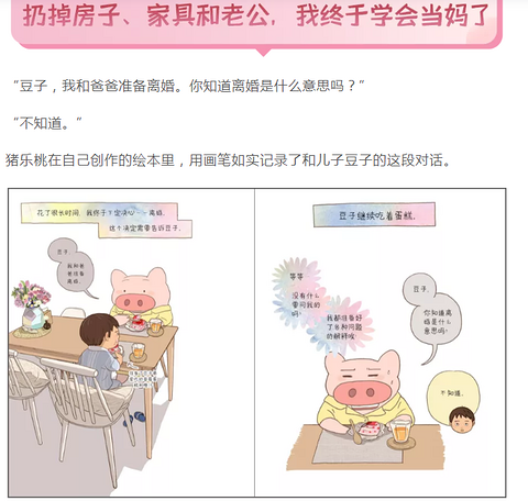 一个年少成名的漫画家,生娃后,则彻底改变了自己的创作方向,开始讲述属于妈妈的故事——这是她从未想过的。 当妈这件事真的很神奇,过程充满艰辛,却带我们抵达原本无法抵达的地方。 本期“妈妈故事”受访人物:猪乐桃,职业漫画家,出版过《听见:和豆子的日常对话》等作品,有一个 9 岁的小男孩,对,就是“豆子”~ 转自年糕妈妈