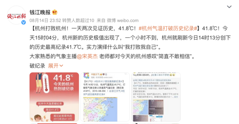 尽管已经立秋,但现在的天气还是热热热热热……杭州的市民热到一天两度见证历史! 8 月 14 日杭州热出了 41.7℃ 气温,打破了历史记录。然而仅仅一个小时不到,又出现 41.8 ℃ 的新纪录!实力演绎“自己打败自己”。 更令大家郁闷的是,这种高温可能还要持续 7 天左右…… 今年如此极端高温下,一个大家之前还挺陌生的词——热射病,频频登上热搜。 转自年糕妈妈