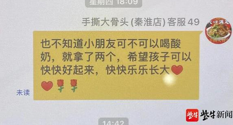 “孩子化疗前最后一餐肉,希望能干净卫生些。”近日,一则辛酸又温馨的视频在网上热传,视频中的外卖店收到了一份有着特殊备注的订单,随后店家为准备化疗的小朋友精心准备了餐食,还送上了酸奶和暖心祝福。 3月8日,记者找到了这家位于南京新街口的外卖店,店老板王猛告诉记者,开店半年,这是他收到过最特殊的一份订单,“看到备注时,自己心里非常不是滋味。而自己所做的都是些力所能及的小事,只是希望能为正在跟病痛做抗