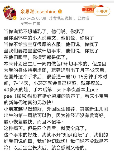 刷微博看到一个妈妈,给40多天的娃儿做了包皮手术,还说孩子恢复得很好国外好像是孩子出生就一起切了,国内感觉这么小做包皮手术的好少哟,你们娃儿做包皮手术了吗?好大才做的