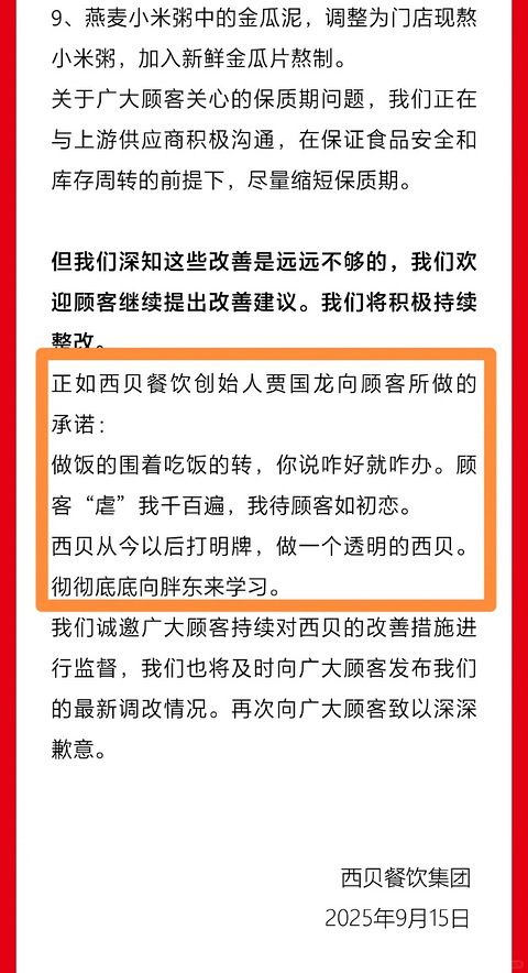 9月15日,@西贝XIBEI官方微博 发文,全文如下: 近日,西贝受到大家的广泛关注与讨论。在这场风波中,我们看到了许多顾客对西贝的关心、疑问与批评。 这些声音,我们都一一记在心里,也深刻意识到:西贝的生产工艺与顾客的期望有较大差异,没有满足广大顾客的需求与期待。 在此,西贝对给顾客带来的困扰和担忧致以深深歉意。向每一位关注此事提出意见、建议的顾客,致以最诚挚的感谢。 同时,请每一位顾客放心,西贝