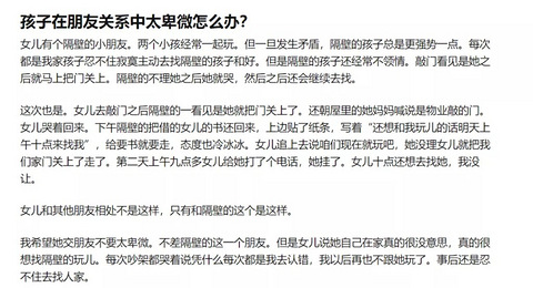 你能想象,一个孩子为了能交到朋友可以承受多少委屈,变得有多卑微吗? 网上一个帖子,看得我心酸不已。 一个妈妈说,自己的女儿4岁半了,特别喜欢和其他小朋友在一起玩。但是妈妈很明显地能感觉到,女儿总是在讨好别的小朋友。为了让别的小朋友接受自己,哪怕受点委屈、吃点亏都无所谓。 但让妈妈没想到的是,女儿竟然卑微到心甘情愿跪在地上,驮着别的小朋友一边爬一边学狗叫。 妈妈赶紧把女儿拉起来,问:“你为什么要这