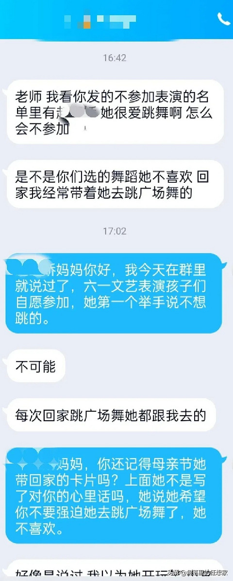 在网上看到一个小学老师的吐槽,麻麻好强势,真让人遭不住 老师说每次跟这个家长沟通,都处于那种“这是亲妈吗”的怀疑中,小姑娘性格本来就内向,不爱说话。家长硬是逼着她要举手发言,让老师多提问她。孩子喜欢的不让做,不喜欢的强迫学。不想跟她沟通,又三不五时的发消息来,不回复直接打电话[白眼]可怜的孩子!