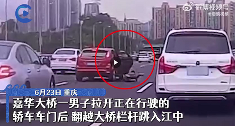 6月23日,重庆。嘉华大桥一男子拉开正在行驶的轿车车门后,翻越大桥栏杆跳入江中。视频显示,男子跳车后摔倒在地,随即爬起跑向桥边栏杆,并从栏杆处翻下。长航重庆分局民警称,跳桥者为一12岁男孩。目前警方正在全力搜救中,具体待官方通报。 转自后浪视频
