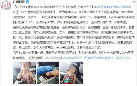 女童甜甜出生3个月就查出感染乳头状瘤病毒(简称HPV),22个月大的她,已经因喉乳头肿瘤堵塞气管,做过6次割喉手术。 由于病情反复,约每3个月就要在相同位置进行手术,孩子的颈部刚愈合又要被切开。 令人痛心的是,甜甜的病因,竟是出生时从母体感染了HPV。