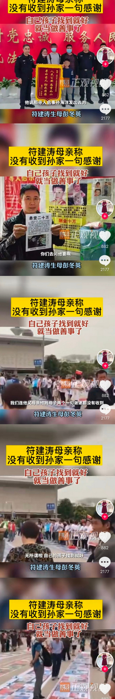 媒体放出一段符建涛妈妈的采访语音,她抱怨都是去现场认亲的,媒体和公安机关对两个家庭态度不一样,“而且他的孩子还是因为我们孩子找到的,连一句谢谢都没有,我至今没有接到他父母给我的一句谢谢,寻人启事下面写的是,提供线索奖励十万,找到孩子奖励二十万。咱们孩子提供线索了,是不是公安机关相应地给孩子一些鼓励啊,毕竟我们孩子也是在读书,后期上大学还是需要一些费用的。(公安机关)说那寻人启事是孙海洋发出去的,你