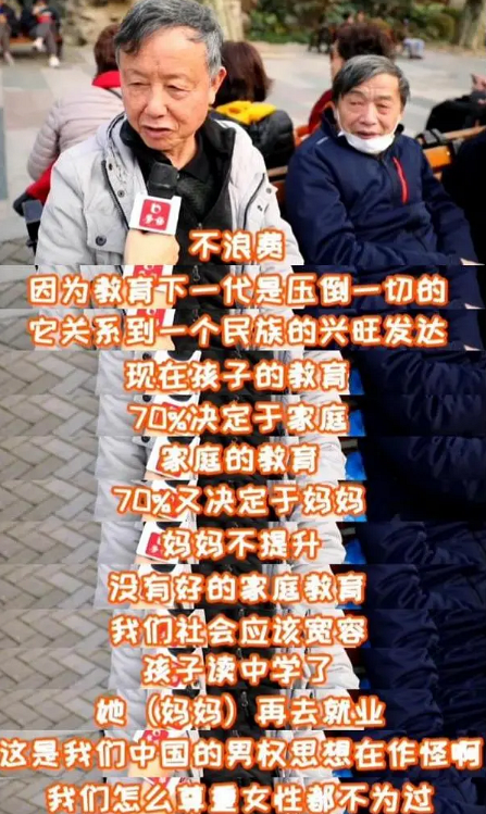 前几天,劳动报进行了一个街头采访,话题加了限定词,问大家“高学历女性做全职太太,是不是浪费?合适吗?” 高学历女性做全职太太是浪费吗?关于这一话题,被采访的几个人也还是呈现了3种声音: 一位爷叔的回答说: 高学历女性做全职太太不浪费,孩子的教育70%取决于家庭,家庭的教育70%取决于妈妈,妈妈不提升就没有好的家庭教育。社会应该宽容,允许女性在孩子读中学后再就业。 最后爷叔还说: 妈妈十月怀胎,辛苦