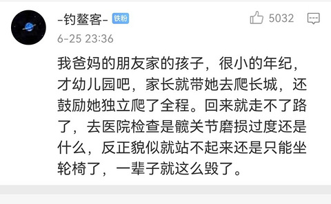 看到这个,真是唏嘘可能很多人都觉得,鼓励孩子自己走,是让孩子独立可是凡事也得适可而止,小孩子,还去爬长城,还爬完全程,别说孩子了,大人都觉得费力也不知道,孩子长大了会不会恨自己的父母@-钓鳌客-: 我爸妈的朋友家的孩子,很小的年纪,才幼儿园吧,家长就带她去爬长城,还鼓励她独立爬了全程。回来就走不了路了,去医院检查是髋关节磨损过度还是什么,反正貌似就站不起来还是只能坐轮椅了,一辈子就这么毁了。