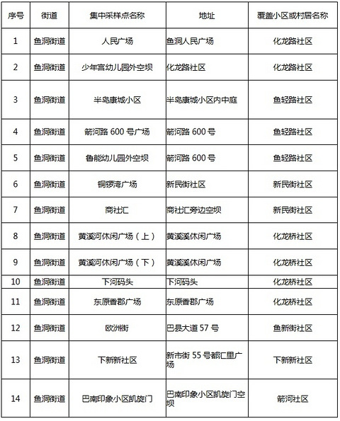 重庆市巴南区新型冠状病毒肺炎疫情防控工作领导小组综合办公室关于开展部分区域大规模核酸检测的通告 全区广大居民: 为保障人民群众生命安全和身体健康,经巴南区新型冠状病毒肺炎疫情防控工作领导小组研究,定于11月3日起开展部分区域大规模核酸检测,现就有关安排及注意事项通告如下: 一、检测范围 鱼洞街道、莲花街道、李家沱街道范围内全部居民(含暂住人员)。 二、检测地点 见附件。 三、有关事项 (一)请各位