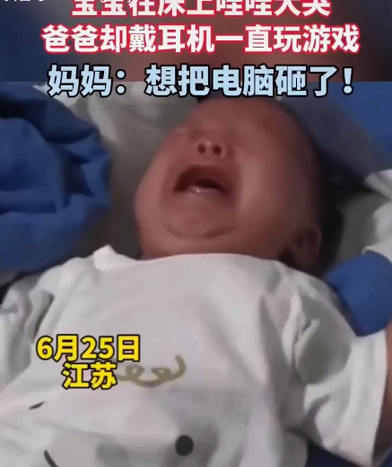 宝宝在床上哇哇大哭,爸爸却戴着耳机一直在旁边玩游戏