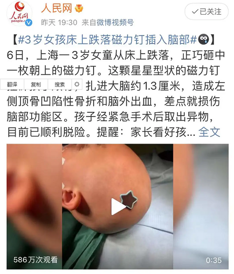 揪心!3岁女孩床上跌落,被“星星”磁力钉刺破脑膜!看着脑壳痛