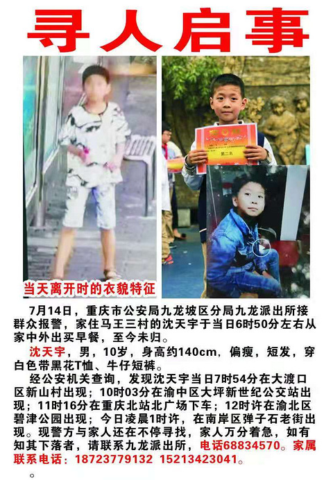寻人!九龙坡10岁男孩14日早上外出买早餐,至今未归