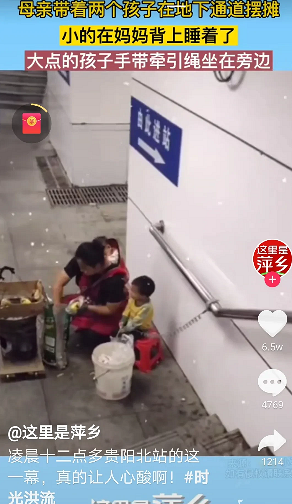 小点的已经在妈妈背上睡着了,大孩子一只手被牵引绳拴在身边的栏杆上,乖乖的坐在妈妈旁边。 这场景看了让人心酸! 其实对于孩子来说,只要跟妈妈在一起,就算是吃苦也是快乐的。不知道这个妈妈经历了什么,也许她就是一个甘心情愿跟男人吃苦的女人吧。希望她的男人,是个有责任心有担当的男人,这时候不会正躺在家里睡大觉! 同为母亲,无比的心疼她!希望路过的人能够体谅她的不易,都去买一点,让她早点回家吧。孩子这么小