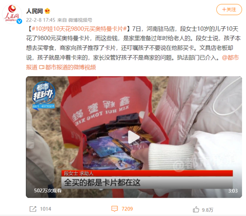 当成年人还在为获得一只冰墩墩而到处寻找购买渠道时,殊不知,在孩童的世界里,满天飞的奥特曼卡片才是真“顶流”。 刚刚结束的315晚会曝光了校门口小卖部里的诸多游戏骗局,很多人都惊诧于这些小玩意儿的复杂程度。而早在上个月,微博上也出现一个话题,#10岁娃10天花9800元买奥特曼卡片#,就引发了大家的关注。 话题内容称,河南驻马店,段女士10岁的儿子10天花了9800元买奥特曼卡片,而这些钱是家里准备