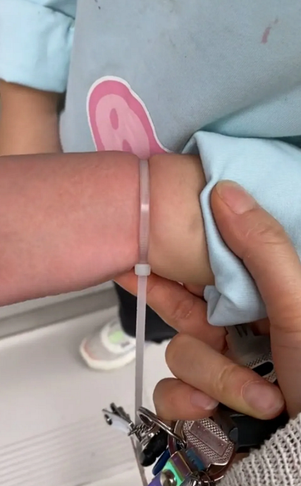 其实这个东西很常见,扎带,但是一般生活总用不到,都是拿来固定桁架、搭建舞台什么的,小孩子拿去耍套在手上,这个东西弄不来的人越拉越紧,而且很牢固肩剪不断,一般用专业道具才行,娃儿手都遭嘞这么紧了空隙也没得