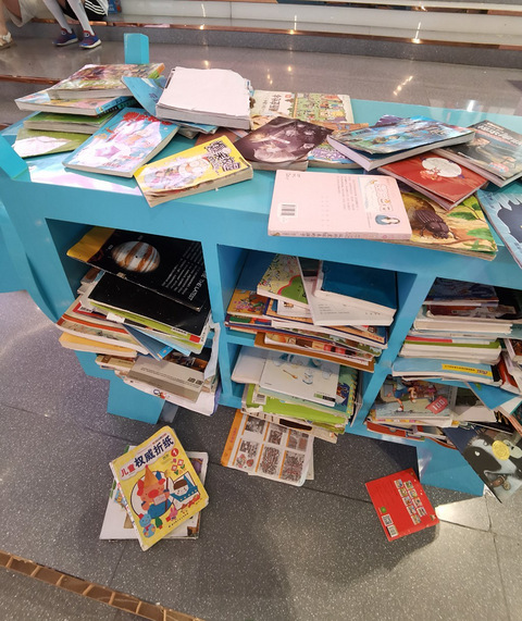周末在龙湖礼嘉天街有个儿童阅读区域,天气热,好多带起娃儿在商场来耍,就在这里看书。我相信这些书肯定都是可以收进书柜的,但是娃儿们看了之后,留下的就是满地的乱七八糟。关键是还有很多家长在旁边坐着,都当没看到。有人会说这里有工作人员,就应该是工作人员来收拾。但是,大家从小都在教育孩子,拿了东西就要放回原位,为什么在外就不能执行?