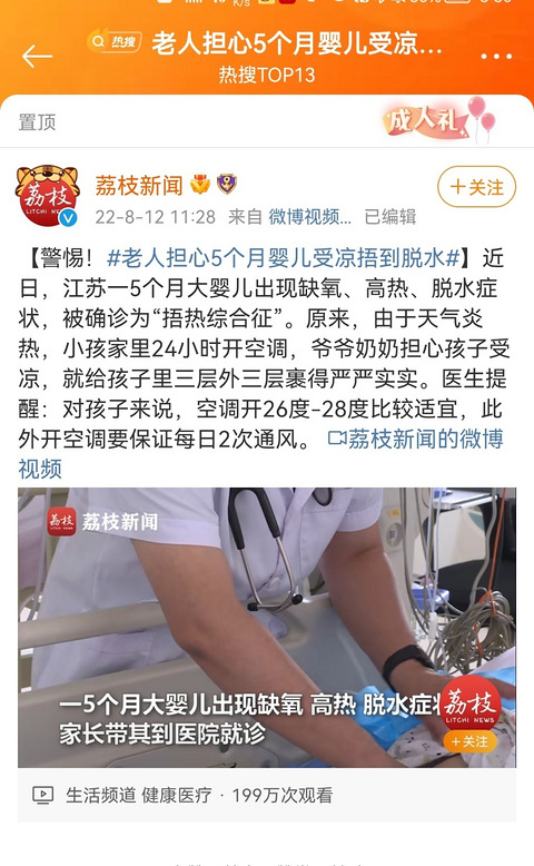 每次看到这种新闻,都觉得孩子能活下来实属不易 近日,江苏一5个月大婴儿出现缺氧、高热、脱水症状,被确诊为“捂热综合征”。原来,由于天气炎热,小孩家里24小时开空调,爷爷奶奶担心孩子受凉,就给孩子里三层外三层裹得严严实实。医生提醒:对孩子来说,空调开26度-28度比较适宜,此外开空调要保证每日2次通风。