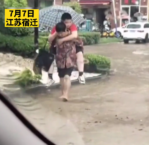 孙子比奶奶高一头,还让奶奶光脚背着过马路,只因下雨路上有积水