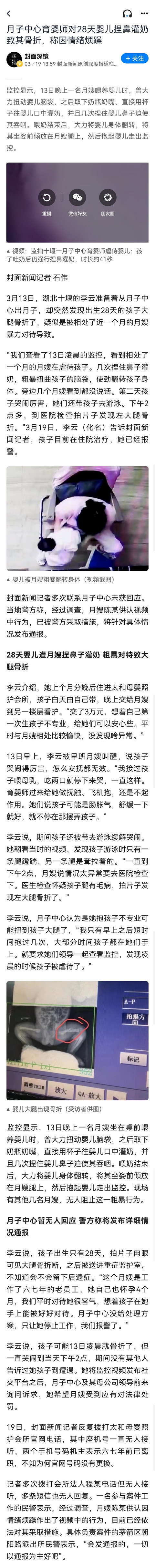 月子中心育婴师对28天婴儿捏鼻灌奶致其骨折,称因情绪烦躁