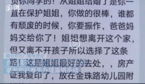 3月15日,安徽合肥。携子女坠亡29岁女子遗信曝光。据合肥广播电视台,女子事发前其已着手办离婚手续,坠楼前曾向家人发遗言。目前家人无法与男方联系,遗体无法火化。 据安徽网消息,3月12日上午,合肥市长丰县阿奎利亚城品小区发生一起坠亡事件,坠楼的妈妈和4岁的女儿当场身亡,另一名仅2岁左右的男婴被送往医院抢救,也不治身亡。