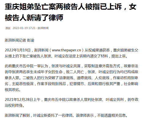 重庆姐弟坠亡案两被告人被指已上诉,叶诚尘请了新律师