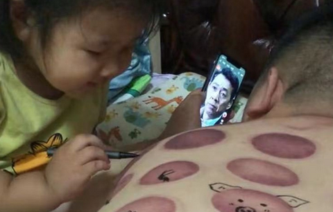 一男子拔完火罐,女儿用笔给爸爸画“纹身”,满满的卡通风格