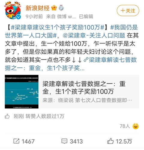 昨天,一个重磅内容出炉,第七次全国人口普查数据公布!内容很有意思,与每个人的生活,很多家庭的未来,息息相关。 各方的报道很多,甚至携程老板,作为人口经济学家的梁建章,也搞了"BOSS直播",并有"建议生1个孩子奖励100万,以后对社会的贡献远超一两百万"的观点。 在昨天的直播中,梁建章提出,用于家庭福利的财政支出越多,生育率越高。如果按照中国每年需要多生1000万的小孩来计算,每个小孩需要给予差