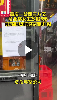 3月6日,重庆一公司三八节给女员工放假6天的通知引发网友热议。6日晚,该公司一刚入职不久的女员工告诉极目新闻记者,“我们公司文化就是宠爱女性,我们早就习惯了。” 网传的一份3月6日印发的《关于“三八”女神节放假的通知》称:公司全体员工,阳春三月,我们如约迎来2022年“三八”女神节,谨向辛勤工作在各部门各岗位的女神们致以衷心的问候。根据公司相关员工福利政策,结合公司“宠爱女性”的使命及文化,“三