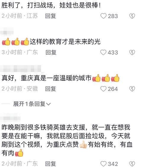 重庆陆续带来好消息,山火灭了,下雨了,有些街道解封了,这一切都值得庆祝!刚刚刷视频看到一位重庆家长带着孩子在缙云山救援现场处理志愿者们战场后的垃圾,父母以身作则才是孩子最好的榜样,孩子好样的!
