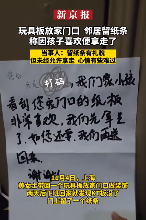 玩具板放家门口,邻居留纸条因孩子喜欢便拿走了......