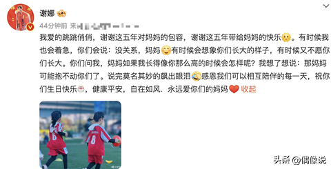 2月1日,谢娜发文庆祝双胞胎女儿跳跳俏俏的生日,感慨孩子们五年来给她带来了很多快乐,还说自己一想到孩子们长大了,可能就抱不动他们了,就莫名其妙飙泪。这让她很珍惜和孩子们相互陪伴的每一天,言辞中充满温柔,尽显一位母亲对孩子们的心疼与关爱。 偶像说