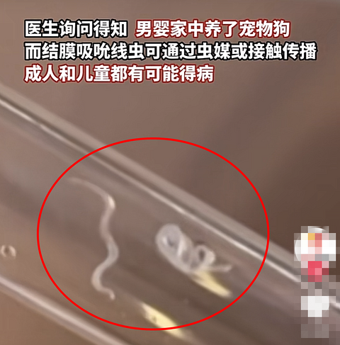 太令人吃惊了 , 浙江杭州8个月男婴眼睛取出8条寄生虫。医生称,基本确诊了主要和家里养宠物有关系。吸猫撸狗注意卫生,宠物定期驱虫,如果眼睛出现不适,应尽就医! 据说男婴出现揉眼的情况,用药后也没有改善,趁着孩子睡着妈妈扒开右眼皮一看,吓了一跳,赶紧带着孩子就医,医生询问得知男婴家中养了宠物狗,而结膜吸吮线虫可通过虫媒或接触传播 成人和儿童都有可能得病,所以家中养有宠物的一定要注意卫生。