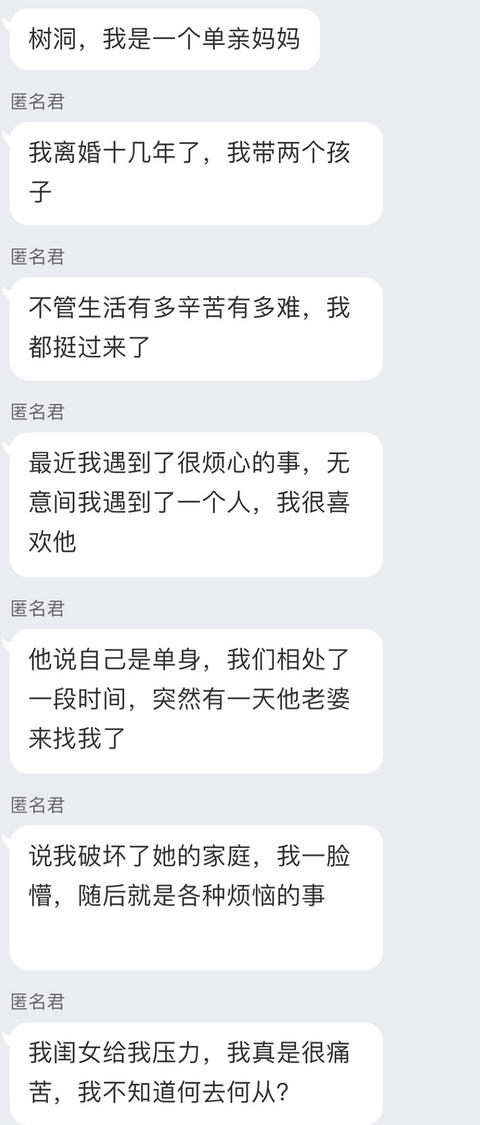 树洞上线,难免有些想说的话不敢说,困惑的事不敢问,难过的事不想憋在心里我是树洞,关注我,私信我,毫无顾忌匿名诉说你的心事、秘密,我会帮你保密,帮你一起寻找答案 树洞第133期: 单亲十几年了,好不容易遇到了自己喜欢的人,爱情亲情真的太难选择了,没想到的是我居然变成了小三,孩子大了,也希望我结束这段感情,看来是我不配别人爱我